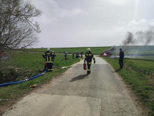 Ein Anhänger ist nach einem technischem defekt den Graben gestürzt und in Brand geraten.