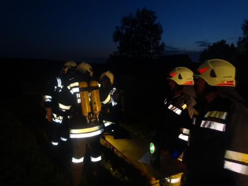 Übungsannahme war ein Bauernhofbrand mit vermissten Personen. Die Feuerwehren Echsenbach, Gr. Haselbach, Stögersbach und Schwarzenau haben mit 58 Mitgliedern an der Übung teilgenommen. Die vermissten Personen konnten unter Einsatz von Atemschutzgeräten sehr rasch gerettet werden. Die Feuerwehren bauten umfangreiche Zubringerleitungen zum Schützen der Nachbarobjekte und zur „Brandbekämpfung“ auf. Neben Abschnittsfeuerwehrkommandant-Stellvertreter ABI Michael Hartner gratulierten auch UA Kommandant, HBI Karl Holzmann, und der Vizebürgermeister aus Schwarzenau, Herr Leopold Aschauer, bei der Nachbesprechung zur lehrreichen Übung.