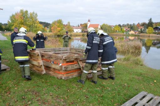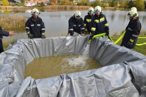 Der Sachbearbeiter für Wasserdienst, Robert Mader erklärte wie aus Paletten, Folie und Zurrgurt ein behelfsmäßiges Auffangbecken errichtet werde kann. Ziel ist es im unwegsamen Gelände, wo keine direkte Wasserversorgung vorhanden ist, ein solches Becken zu errichten und mit Güllefässern zu füllen. Im Einsatzfall können so die Löschfahrzeuge mit Wasser versorgt werden. Die Kameradinnen und Kameraden konnten das Becken in nur wenigen Minuten aufbauen und testweise mit einer Unterwassserpumpe befüllen.