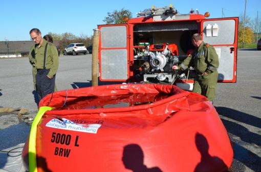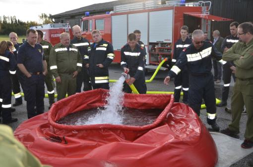 Als dritte Station, wurde durch die Freiwillige Feuerwehr Dietmanns ein „Wasserentnahmebecken“ vorgeführt. Dieses Becken lässt sich äußerst schnell aufbauen und fasst 5000 Liter. Bei Bränden wo Wasserknappheit herrscht kann so ein Becken als Zwischenpuffer verwendet werden um mit Güllefässern etc. Wasser nachzubringen. Geübt wurde das füllen und entnehmen mittels Tragkraftspritzen und Unterwasserpumpen.